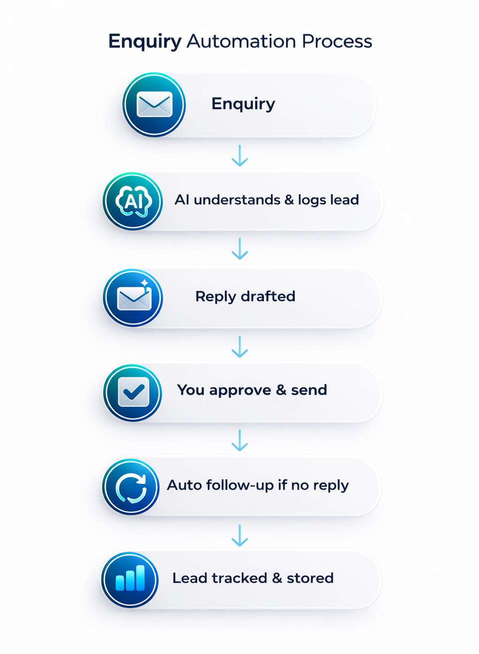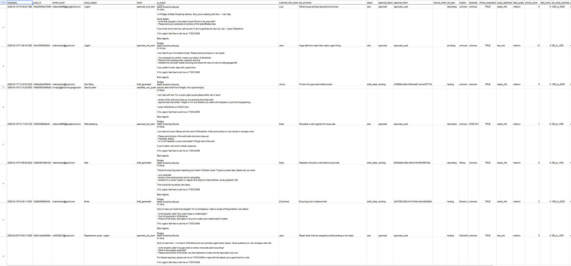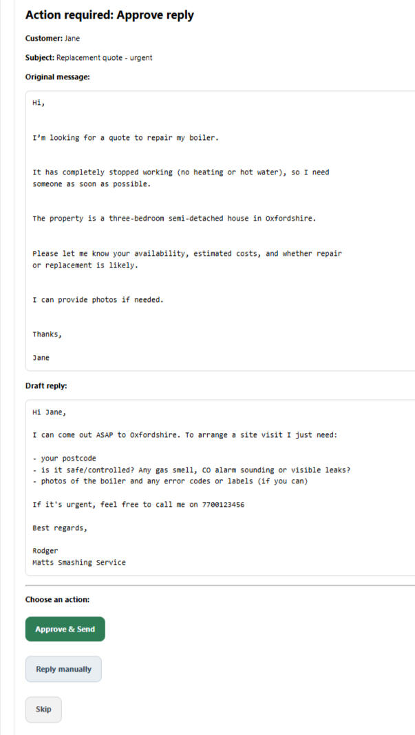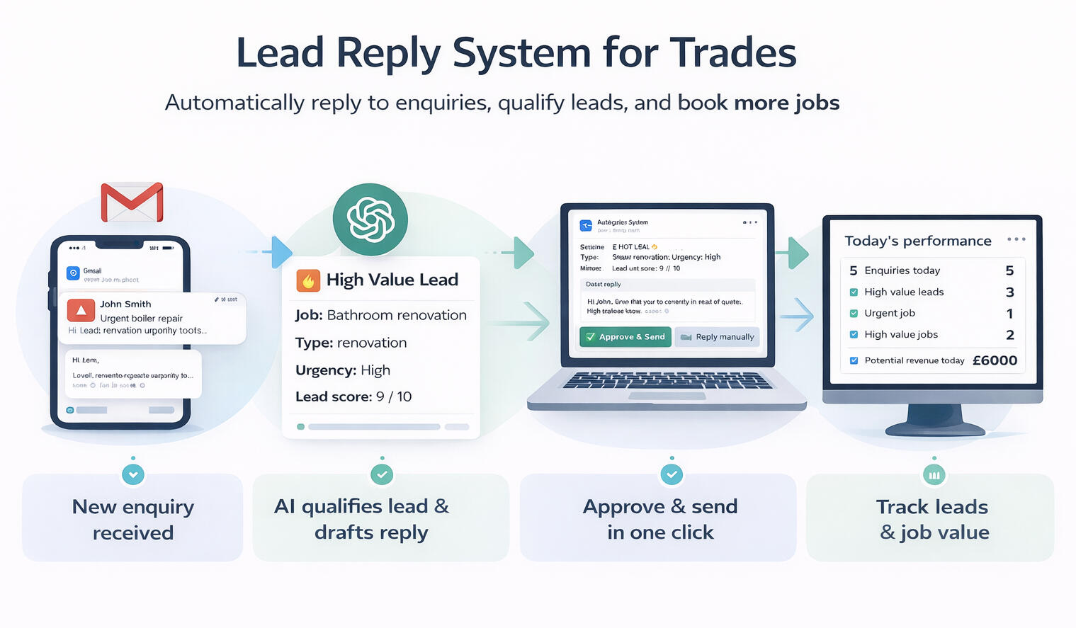 • Enquiry comes in• AI reads & understands the job• Lead is scored (hot / medium / low) Reply is drafted instantly• You approve or auto-send• System Logs all details (Name, address, email, etc).• Automatic follow upNothing slips through the cracks. Time saved. More jobs booked every week.